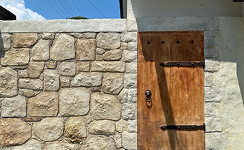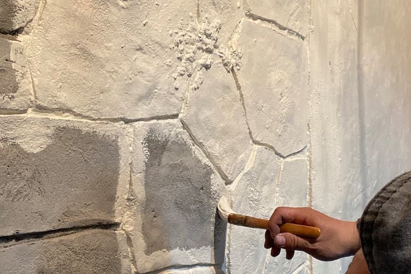壁面にモルタルを塗りつけ、固まるまでのやわらかい内に特殊ツールやブラシでレンガや石、枕木などをリアルに表現する技術。